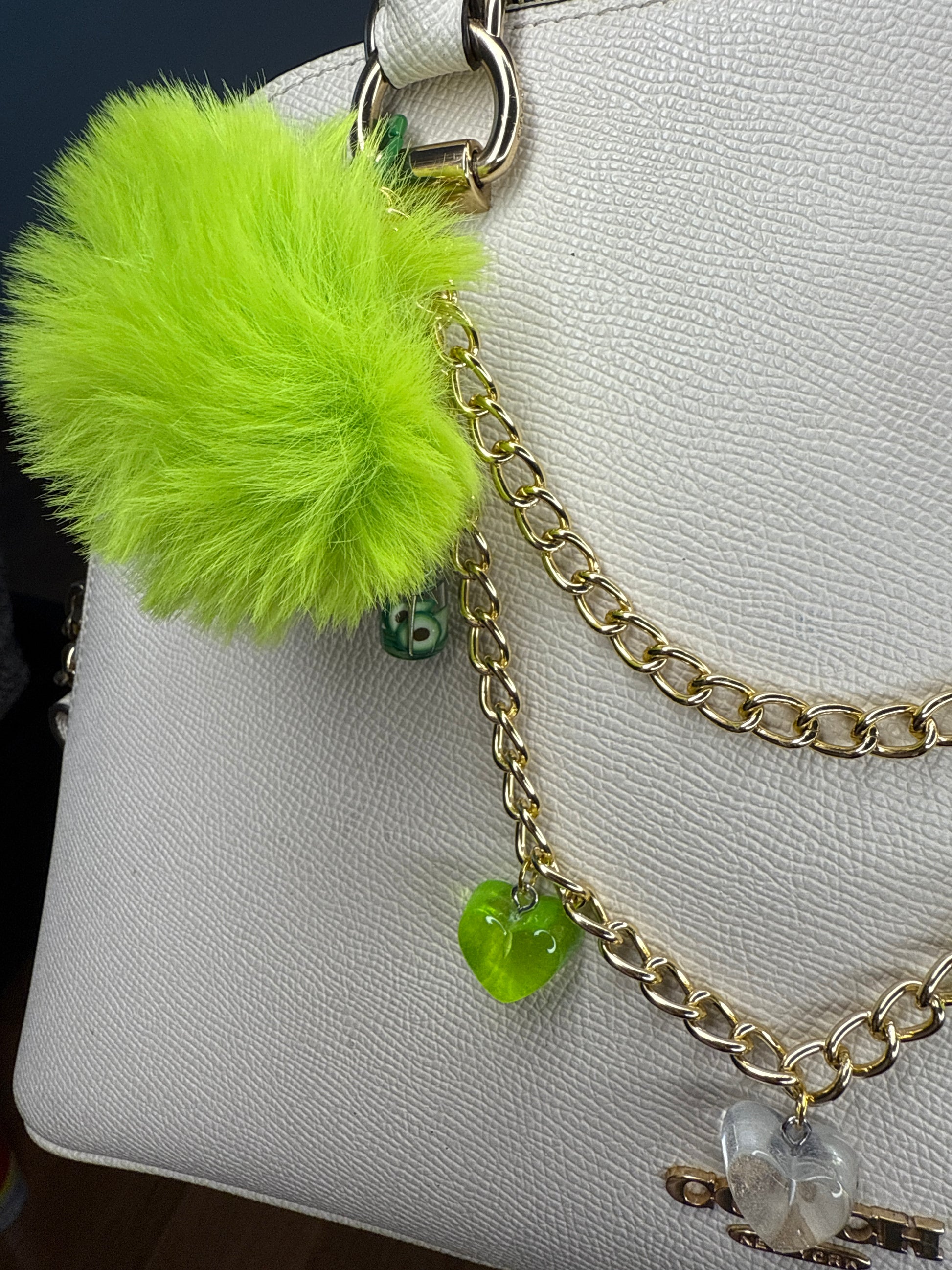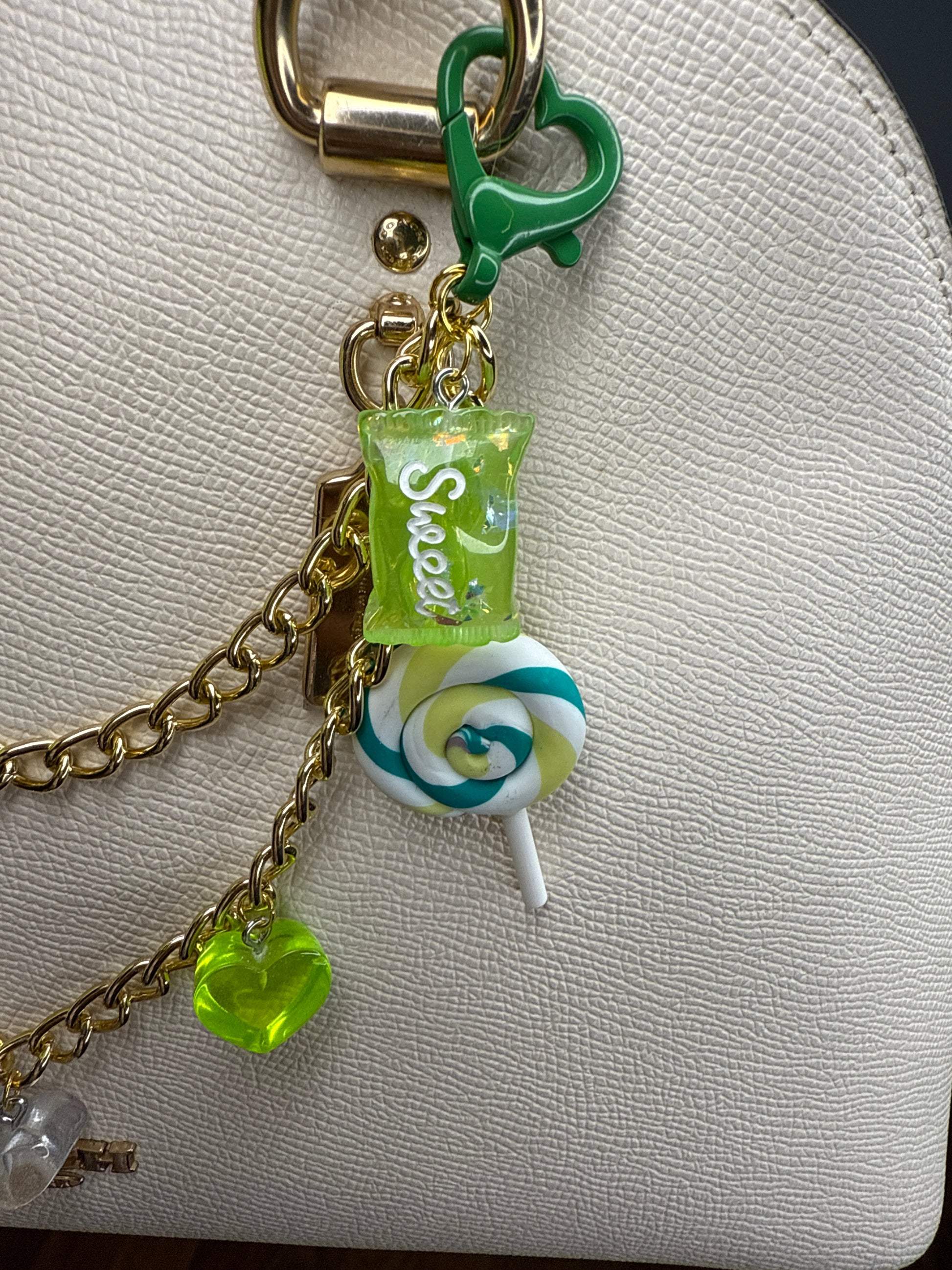 This Sour Apple candy charm brings cute + playful vibes with a fluffy green pom, gold chain, and candy details.